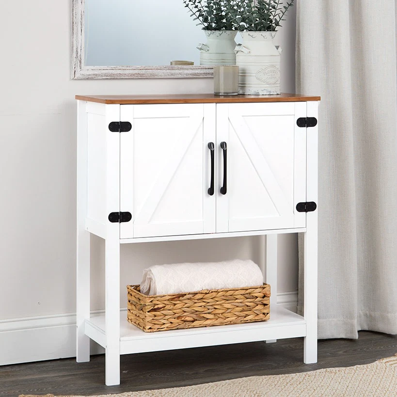 The 2-Tone Storage Cabinet is the perfect blend of function and style for any living space. With its chic 2-toned design, it features white cabinet legs and a lower shelf, while the top showcases a natural wood look, adding a touch of rustic charm to your home. This cabinet can effortlessly hold up to 60 lbs. on top and 15 lbs. on the shelf, making it ideal for both display and storage.