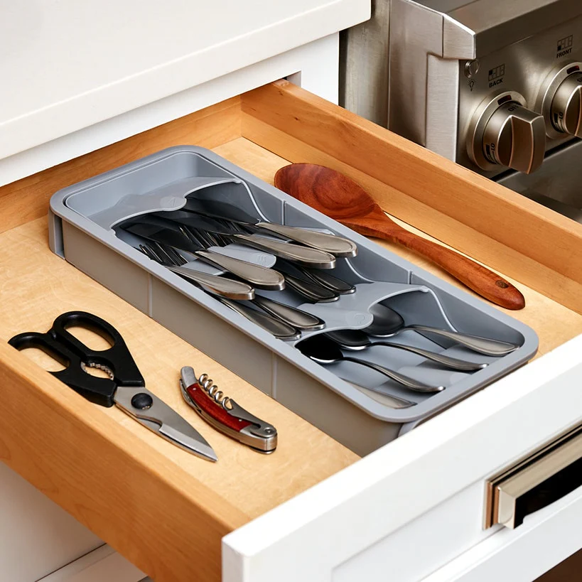 Compact Expandable Drawer Organizers are the perfect solution for bringing order to messy kitchen drawers while maximizing precious space. Designed to make your life easier, these organizers feature a two-tier system with a top section that holds cutlery or smaller utensils and expandable sides for larger kitchen tools and accessories. Whether you're separating everyday silverware, organizing specialty gadgets, or managing your favorite cooking tools, the compact organizers will keep everything neatly visible and easy to grab when you need it. With options like the Expandable Cutlery Drawer Organizer and the Expandable Utensils Drawer Organizer, you can tailor each drawer to fit your specific needs. No more hunting for that one missing spatula or pairing knives—it’s all at your fingertips. These sleek and practical organizers can turn any kitchen into a chef’s dream by reducing clutter while enhancing functionality. Plus, they’re quick to install and immediately help to transform your space into a tidy, stress-free zone.