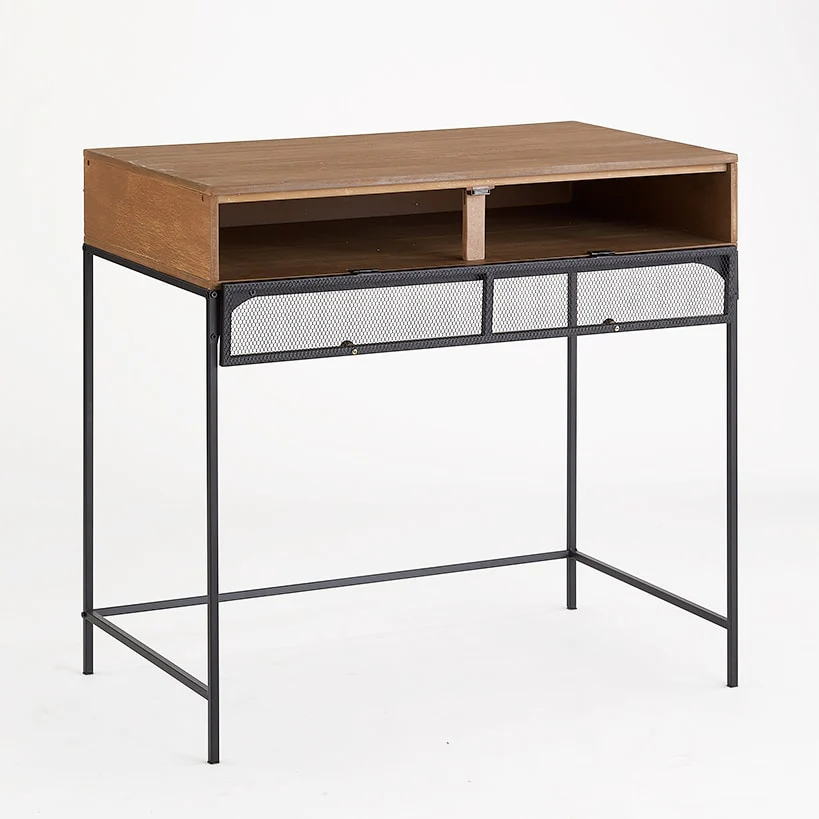 Make a stylish statement in your home office workstation with this Industrial Farmhouse Style Desk with Storage. This industrial farmhouse desk features a rustic wood and metal desk design that adds a warm, charming touch to any room. Use the hidden storage compartment with its unique drop-down wire door to keep essentials organized yet easily accessible. Choose between the Walnut or White finishes to perfectly complement your existing decor and create a productive workspace