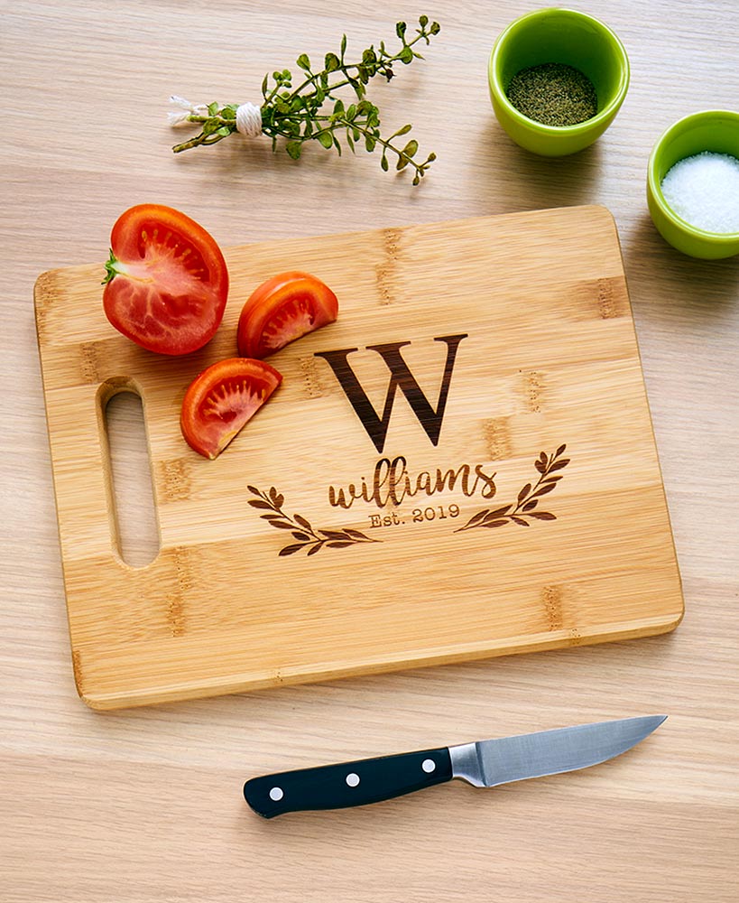 Perform chopping tasks with flair using this Personalized Bamboo Engraved Cutting Board. Made of 100% sustainable bamboo, it features your name engraved into the surface. It has rounded corners and a carrying handle. Makes a great wedding, housewarming or anniversary gift! For Corner Script, personalize it with your name of up to 15 characters in upper and lower case and year in YYYY format. "The" and "Established" are given. Personalize Fancy Scroll with your name of up to 15 characters in all caps. Personalize the Circle Monogram choice with your initial, name (up to 15 characters) and year in YYYY format. All caps. "Est." is included. Olive Branch can be personalized with your initial, 15-character name and year (YYYY format) in upper and lower case. "Est." is given. Personalize Mr. & Mrs. with your name of up to 15 characters in upper and lower case and year in YYYY format. "Mr. & Mrs." and "est." are given. Sorry, mail/fax orders not accepted on personalized items; please order via web or phone agent. This item cannot be shipped to P.O. boxes and APO/FPO addresses.