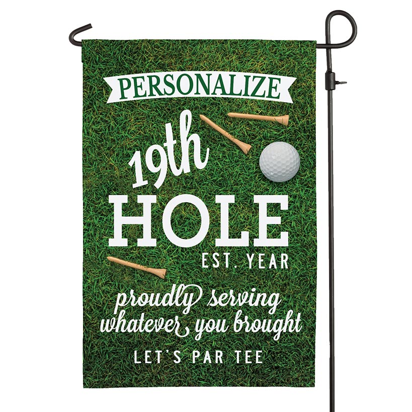 Turn your outdoor space into a golfer’s paradise with the Personalized Golf Garden Flag! This playful and vibrant gift is a must-have for any golf lover. Select from 19th Hole personalized with a name up to 14 capital letters and a year in 4 digits; and Par-Tee customized with a name with up to 16 capital letters and a year in 4 digits. The word "The" is not included in the design; please include in the personalization if desired. Sorry, mail/fax orders not accepted on personalized items; please order via web or phone agent. This item cannot be shipped to P.O. boxes and APO/FPO addresses.