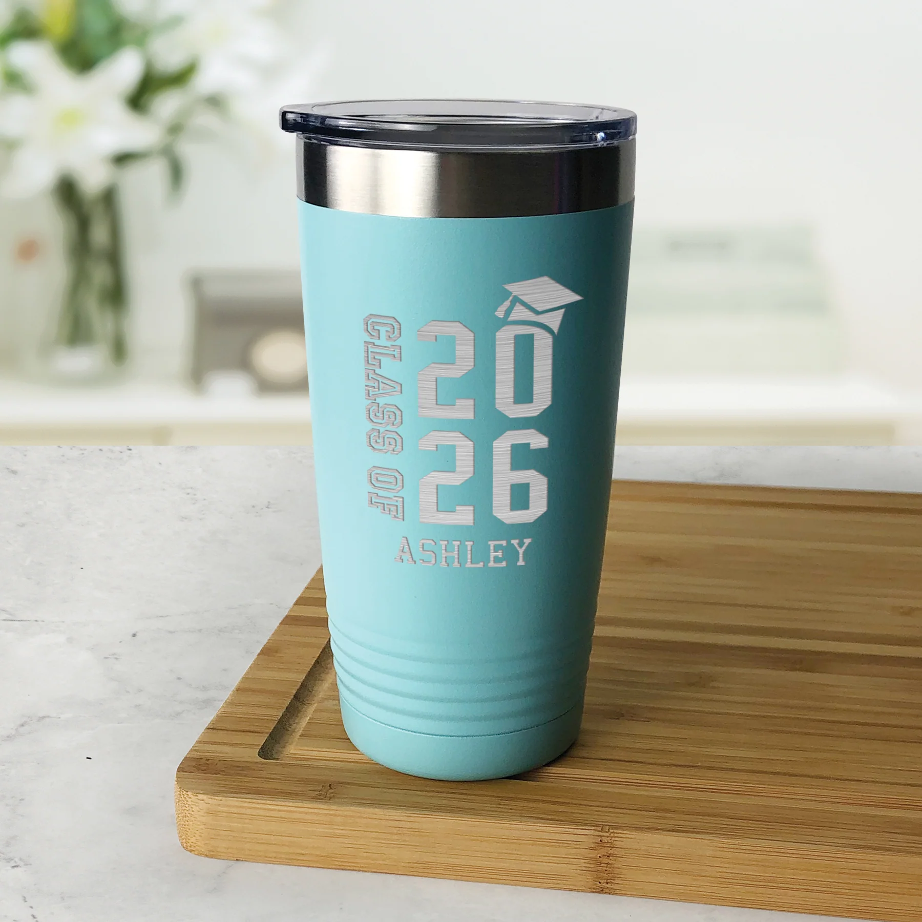Personalized Class of with Cap and Name Tumbler is a perfect gift for any graduate. Handsome tumbler has double-walled insulation that helps it keep drinks hot and cold for longer than a normal glass. Add 2 digits for the graduation year. Personalize it with up to 12 uppercase characters. Sorry, mail/fax orders not accepted on personalized items; please order via web or phone agent. This item cannot be shipped to P.O. boxes and APO/FPO addresses.