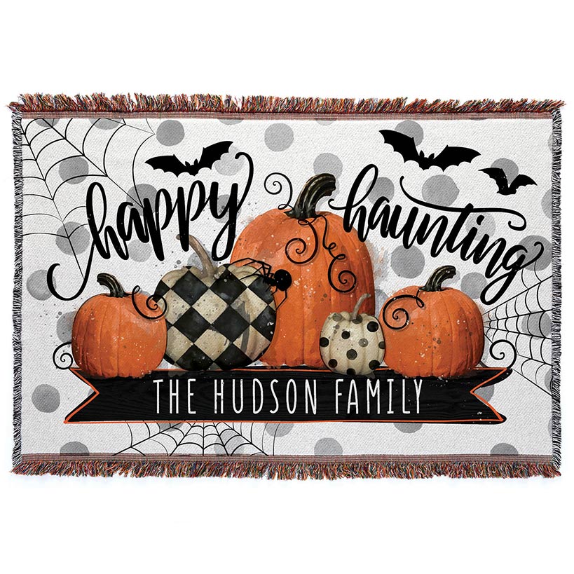 Haunt your home in style with the Personalized Happy Haunting Fringe Blanket! This spooky Halloween throw blanket features a colorful pumpkin display surrounded by cobwebs and bats--perfect for adding a festive touch to your sofa, loveseat, or bedroom. You can personalize this blanket with a name using up to 24 uppercase characters, making it a unique autumn accent just for you. Snuggle up in comfort and show off your love for Halloween with this delightful, customizable throw. Sorry, mail/fax orders not accepted on personalized items; please order via web or phone agent. This item cannot be shipped to P.O. boxes and APO/FPO addresses.