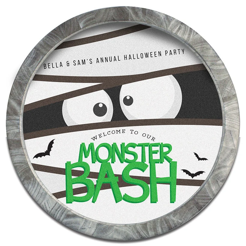Welcome guests to your spooky celebration with the customized home decor of the Personalized Halloween Monster Bash Wall Sign! This charming round sign, adorned with the message "Welcome to Our Monster Bash," adds a playful touch to your decor. Personalize the round wood sign with a message of up to 60 uppercase characters to make it uniquely yours. Perfect for indoor use or under a covered porch, this sign features a jute rope hanger for easy display. Sorry, mail/fax orders not accepted on personalized items; please order via web or phone agent. This item cannot be shipped to P.O. boxes and APO/FPO addresses.