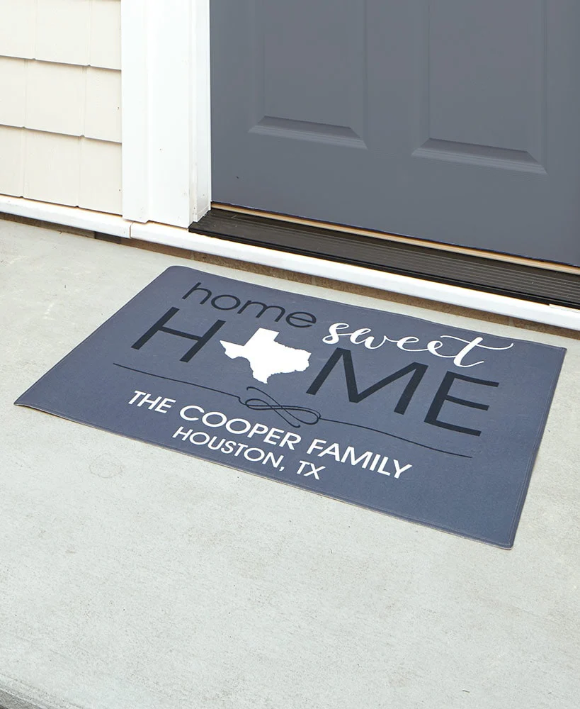 Let your guests know they've arrived at the right place with this Personalized HOME State Doormat or Garden Flag. The design features the phrase "Home Sweet Home" with the "O" in the second "Home" replaced with an outline of your state. Personalize the doormat with 2 lines of text. Line 1: Family name in up to 30 characters ("The" and "Family" not given). Line 2: Open text with a 30 character max. Personalize the flag with 2 lines of text with "The" in the line above the personalization. Line 1: Family name in up to 20 characters. Line 2: Open text, 30 characters max. All text is in caps. Sorry, mail/fax orders are not accepted on personalized items; please order via web or phone agent. This item cannot be shipped to P.O. boxes and APO/FPO addresses.