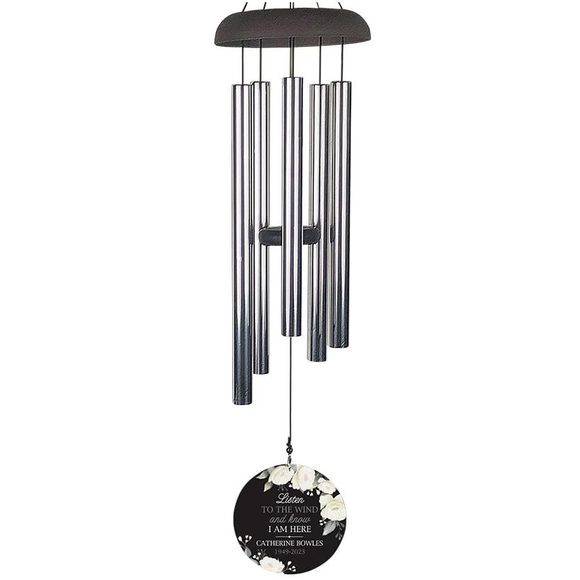 The Personalized 30" Memorial Wind Chime offers a gentle reminder of a lost loved one whenever the breeze blows. The beautiful floral-accented 4" sail reads "Listen to the wind and know I am here." Personalize it with a name (up to 25 characters, all caps) and date range (up to 11 characters). Sorry, mail/fax orders are not accepted for personalized items; please order via web or phone agent only. This item cannot be shipped to APO/FPO addresses.