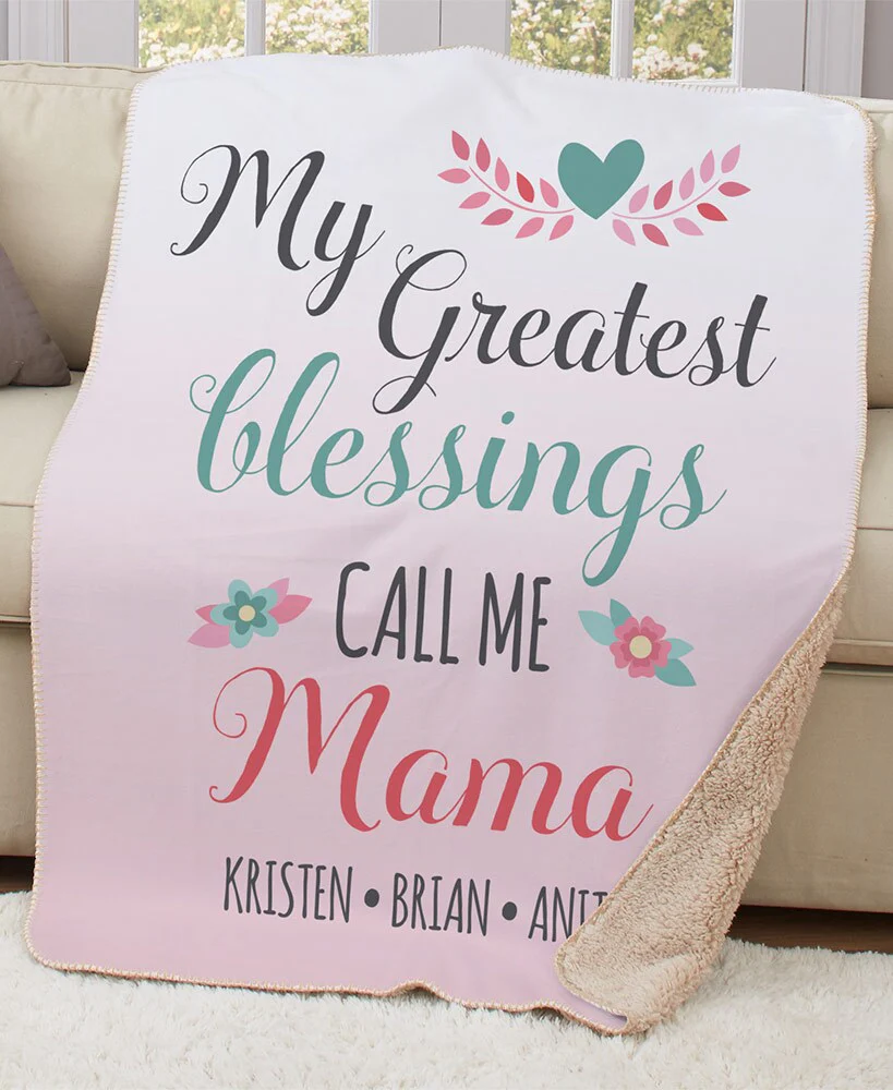 Any mother or grandmother will love this Personalized Greatest Blessings Throw or Pillow. Personalize each item with the recipient's title of up to 16 characters in upper and lower case and with up to 16 names in up to 12 characters each, all caps. Sorry, mail/fax orders are not accepted on personalized items; please order via web or phone agent. This item cannot be shipped to P.O. boxes and APO/FPO addresses.