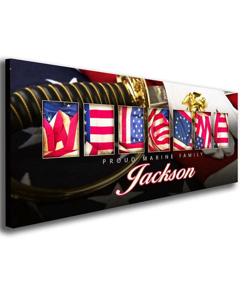 Personalized Proud Military Family Art is the perfect way to welcome guests to your home. The sign features the word Welcome spelled out using high-res photography of Old Glory. Beneath Welcome, it says Proud (insert military branch) Family and then your family name. The background image represents your chosen branch. 25-Character max. Sorry, mail/fax orders not accepted on personalized items; please order via web or phone agent. This item cannot be shipped to P.O. boxes and APO/FPO addresses.