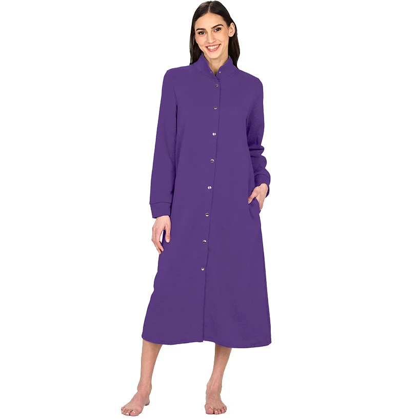 The Women's Snap Front Lounger is a fleece nightgown for women designed to keep you cozy and relaxed all day long. Whether you're snuggled up with a book on a chilly morning, heading to grab the mail, or simply lounging at home, this women's house robe has you covered. Available in Grey, Navy, Purple, and Raspberry, it features a snap front, a stand-up high neckline for added warmth, and handy side pockets for essentials like glasses, your phone, or the remote.